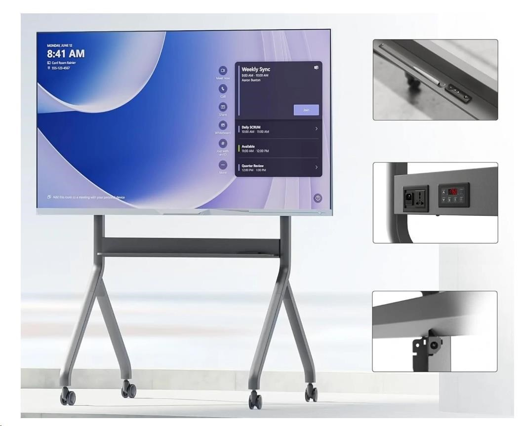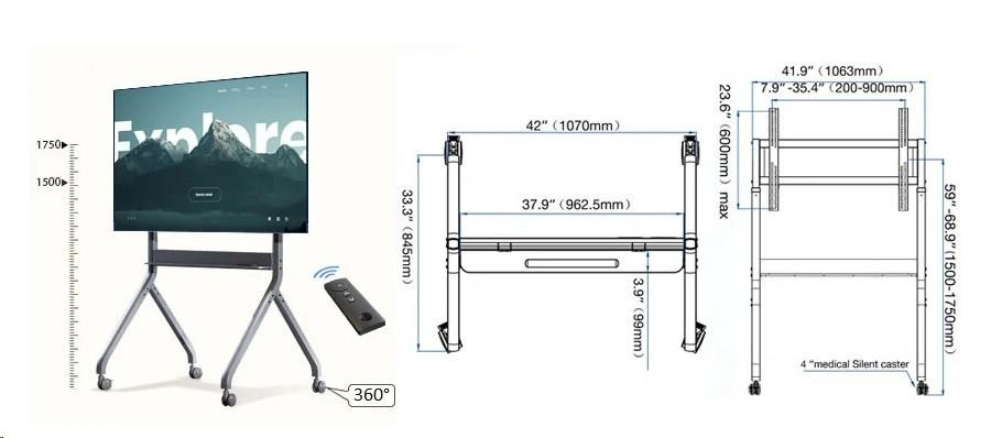 Kvalitní, velmi pěkný pojízdný televizní stojan s elektrický pohonem pro úpravu výšky obrazovky od 1500 mm do 1750 mm. Stojan má polici na příslušenství 962x99 mm s integrovaným ovládacím panelem, 4 otočná pojezdová kolečka s aretací a držák Tv s podporou VESA 200x200 až 900x600. Součástí balení je i dálkové ovládání. Vynikající ocelová konstrukce s nosností 90,9 kg zajišťuje vynikající pevnost, stabilitu a odolnost. Na stojan poskytujeme záruku 3 roky. Stojan na interaktivní tabuli / televizi / dotykovou obrazovku / monitor NB P220 Popis: Univerzální mobilní stojan pro středně velké a velké obrazovky Perfektní řešení pro interaktivní tabule a multimediální obrazovky Široká, stabilní základna se snadným přístupem k dotykovým obrazovkám Elektrické nastavení výšky obrazovky Kvalitní materiály, velmi pevná a odolná konstrukce Police na příslušenství s ovládacím panelem Podpora standardu VESA Jednoduchá a rychlá montáž Ideální pro konferenční místnosti, školy, na výstavy, prezentace, přednášky nebo pro soukromé použití Čtyři otočná kolečka s funkcí aretace Vysoká nosnost, skvělá stabilita, tichý a spolehlivý motor Barevné provedení grafit Elektrický stojan na multimediální tabule a multimediální dotykové monitory NB P220 Technické údaje: Nosnost 90,9 kg Pro obrazovky 60" - 100" Podpora VESA standardů 200x200 až 900x600 Výškové nastavení v rozsahu 150 ~ 175 cm Otočná kolečka o průměru 75 mm s funkcí aretace Pevná ocelová konstrukce Spodní police na příslušenství s ovládacím panelem, rozměry: 962 x 99 mm Dálkové ovládání Výkonný motor 75W Napájení 240V / 110V Povrchová úprava: práškový lak Barva: grafitová Záruka 3 roky.