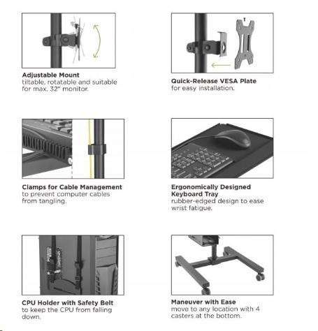 Pojízdný stojan na PC monitor a klávesnici Fiber Mounts AX793 Profesionální řešení pro Vaše mobilní PC pracoviště - mobilní stojan na PC Potřebujete si vytvořit pojízdné PC pracoviště za co nejlepší cenu? Máme pro Vás kompletní řešení za bezkonkurenční cenu - pojízdný stojan s držákem na PC, držákem na monitor a policí na klávesnici. Vše je přitom ergonomické - nastavitelná výška, náklon a natočení monitoru, nastavitelná výška klávesnice a myši, výškové nastavení držáku PC, pojezdová kolečka s aretací. Barevné provedení černé, záruka 3 roky. Stojan na PC s držákem monitoru a policí na klávesnici a myš - mobilní pojízdná PC pracovna -Fiber Mounts AX793 Technické údaje: držák na PC s výškovým polohováním, nosnost 8kg police na klávesnici a myš s výškovým polohováním, nosnost 2kg držák na monitor 17" až 32" s výškovým polohováním, nosnost 10kg držák monitoru podporuje VESA 75x75 a 100x100 / možnost rozšíření až na 200x200 otáčení monitoru do stran +/- 180° náklon monitoru +/- 15° rotace monitoru +/- 180° celková nosnost stojanu 20kg pojezdová kolečka s brzdou systém vedení kabeláže výborná kvalita barevné provedení černé záruka 3 roky Profesionální PC pracovna, pojízdná / mobilní - Fiber Mounts AX793 Stojan na PC, monitor a klávesnici s myší AX793 podporuje VESA standardy pro uchycení monitorů: VESA 75x75 VESA 100x100 v případě potřeby možnost zakoupení rozšíření na VESA 200x100 v případě potřeby možnost zakoupení rozšíření na VESA 200x200.