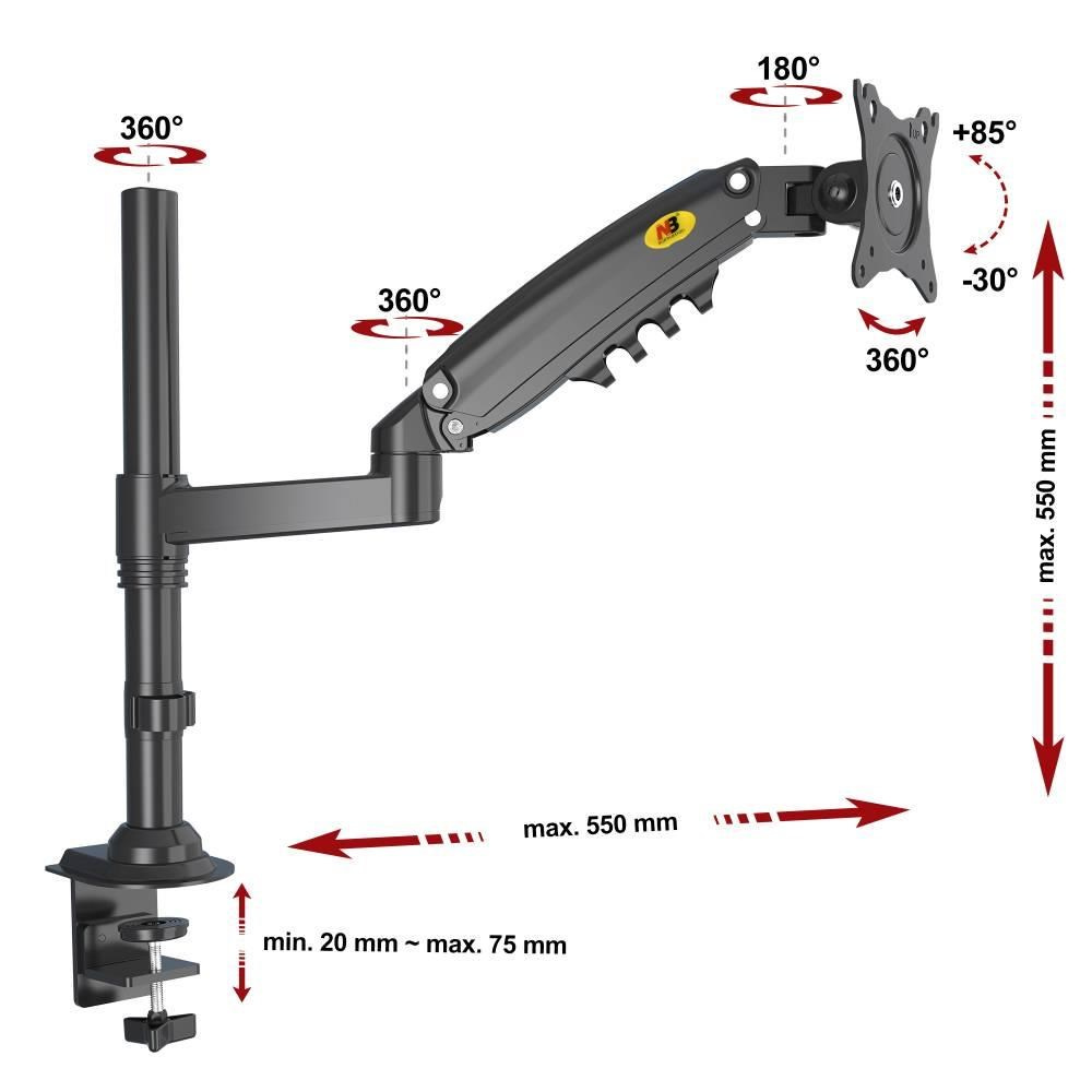 Držák na monitory 17-27", uchycení na hranu stolu nebo do prostoru, otáčení do stran +/-180°, náklon +80/-35°, pivot, vedení kabeláže, VESA 75x75 a 100x100, nosnost 9kg.... více