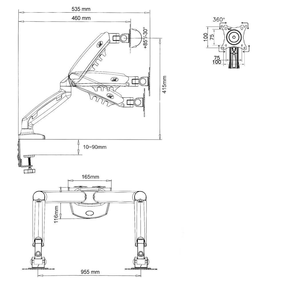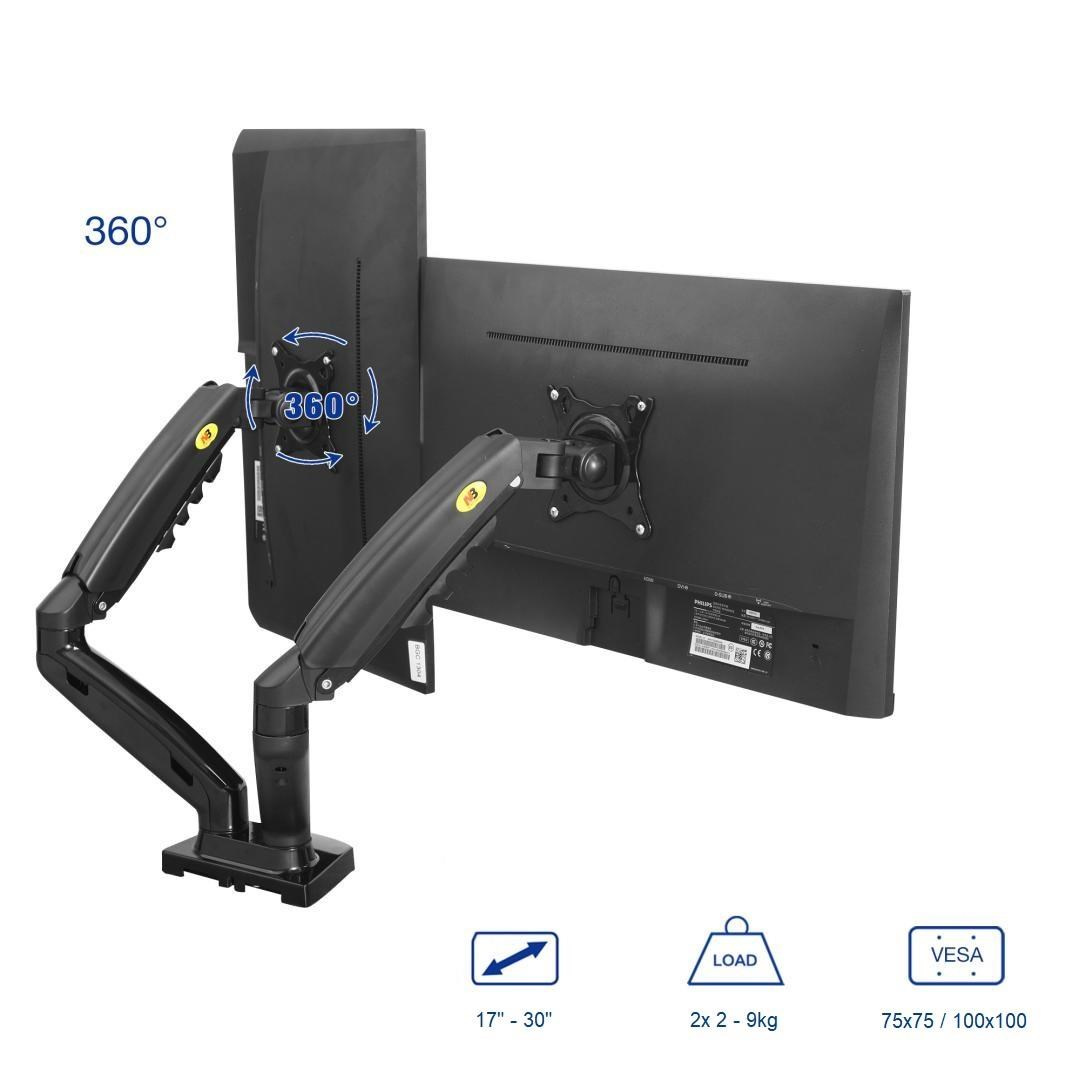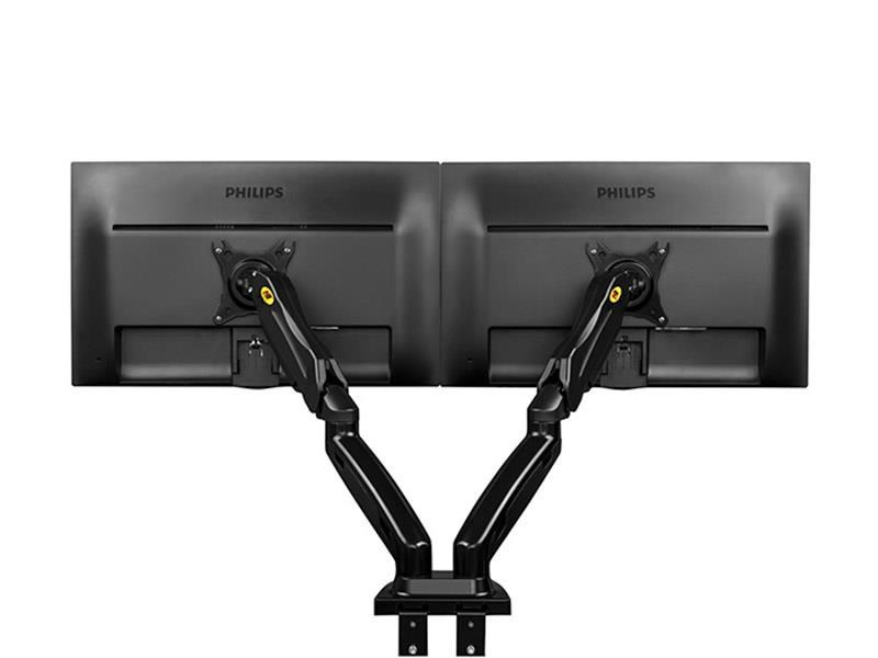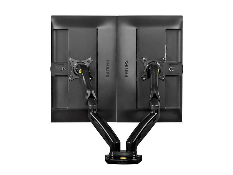 Zavěšení 2 monitorů 17-30", nezávislé nastavení každého monitoru, výškové polohování 140-400mm, otáčení do stran +/-180°, naklápění +85°/-30°, vzdálenost od úchytu 0-530mm, pivot +/-360°, VESA 75x75 a 100x100, nosnost 18kg.... více