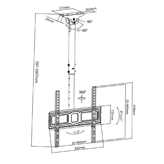 Stropní (nástěnný) držák na Tv 32-60", nastavení délky 717-1017mm, náklon Tv 0-21°, VESA 75x75 až 400x400, vedení kabeláže, nosnost 35kg.... více