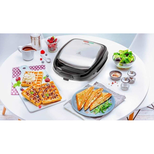 Tefal Snack Time 2 v 1, multifunkční přístroj s kovovou vložkou pro přípravu trojúhelníkových toustů a vaflí, představuje jedinečné řešení, které spojuje sendvičovač a vaflovač pro vždy dokonale sladké i slané chuťovky. Navíc jeho kovový vzhled dodá výrobku prémiový design.