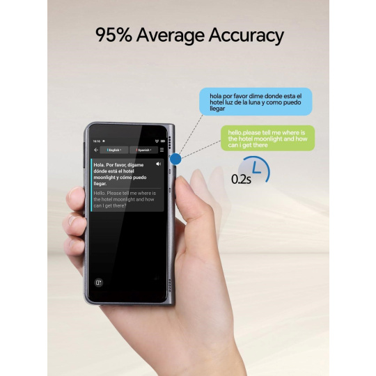 Neztrácejte ani vteřinu! S Timekettle T1 zažijete překlad s neuvěřitelně rychlou reakční dobou pouhých 0,2 sekundy, což zaručuje plynulé a přirozené konverzace bez zbytečných prodlev. Díky špičkovým algoritmům a pokročilé technologii LLM dosahuje zařízení průměrné přesnosti překladu až 95 %, takže se můžete spolehnout na srozumitelnost a správnost každé věty. Komunikujte sebevědomě a efektivně, s jistotou, že vám nic neunikne.