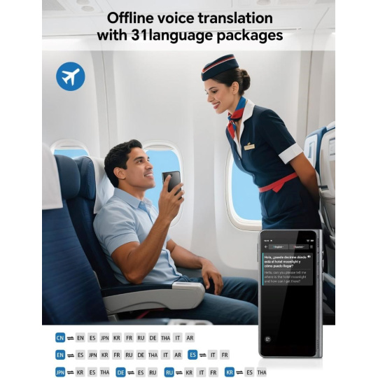 • Už žádné jazykové bariéry, i off-line. Díky technologii AI Edge-Model a 31+ off-line jazykovým balíčkům překládá spolehlivě i bez připojení k internetu.