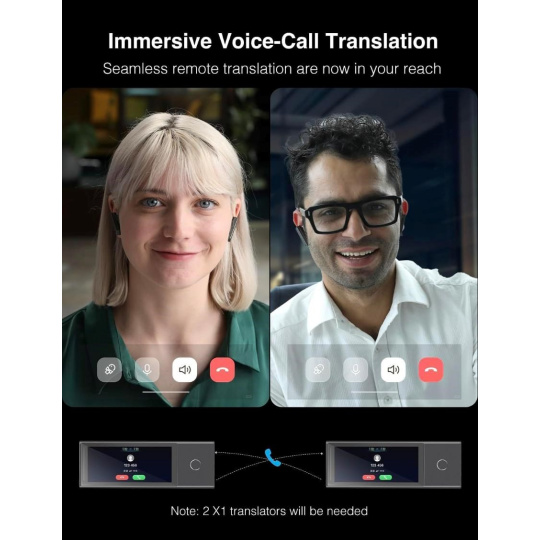 AI tlumočník X1 je ideální pro dvoucestné překlady, kdy si můžete půjčit jedno sluchátko svému partnerovi a druhé si ponechat vy sami. Tento způsob umožňuje simultánní překlad bez nepříjemných prodlev či přerušení konverzace. Výsledkem je plynulý a přirozený dialog, který zachovává dynamiku a komfort komunikace. X1 vám tak pomůže překonat jazykové bariéry v každé osobní i obchodní situaci. Případně se můžete spolehnou na vestavěný reproduktor.