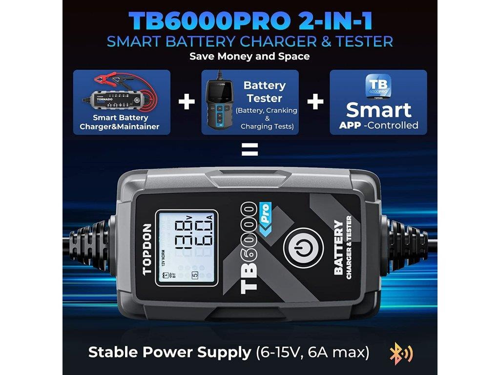TB6000Pro podporuje podrobné testy nabíjení a 'cranking' testy pro 12V a 24V a poskytuje vynikající diagnostiku baterií prostřednictvím mobilní aplikace.