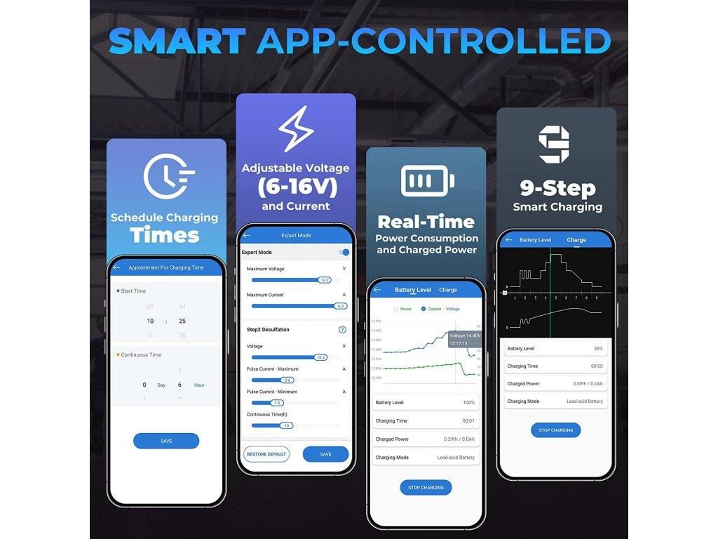 Kompatibilní se všemi typy 6V a 12V olovo-kyselinových baterií a 12V lithiových baterií (LiFePO4). Podporuje i více typů baterií: LI, zaplavené, gelové, MF, CAL, EFB, AGM.