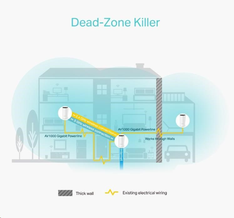 - Síť prochází stěnami a podlahami – Snižte dopad zdí a jiných překážek na signál.