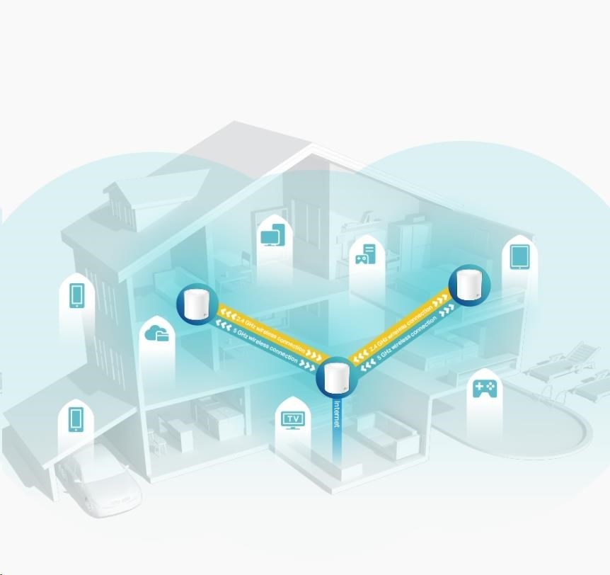 - Jedna sjednocená síť - Více jednotek tvoří domácí síť, která automaticky vybere nejlepší spojení, když se pohybujete po domácnosti.