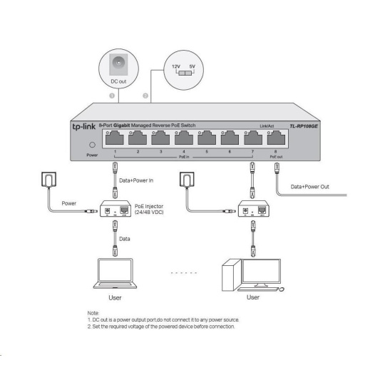 Pasivní PoE switch RP108GE (TL-RP108GE) má sedm gigabitových PoE vstupních portů, které umožňují získávat elektrickou energii z uživatelských zásuvek pomocí PoE injektorů. Vybaven jedním PoE výstupním portem může switch napájet CPE nebo podobné zařízení pomocí Portu 8. Výstupní DC port podporuje obě napětí 5 V a 12 V a lze jej tak použít k napájení zažízení jako ONT. Díky integraci přepínání dat a PoE napájení do jednoho zařízení, RP108GE šetří místo, minimalizuje množství kabelů a eliminuje potřebu vyhrazené elektrické zásuvky - snižuje tak náklady na instalaci a zjednodušuje instalaci PoE zařízení. Poznámka: Vstupní PoE porty podporují pasivní 24V a 48V PoE injektory. Použijte pouze jeden typ injektorů, nekombinujte různé úrovně napětí. Úroveň napětí výstupního pasivního PoE portu je shodná s napětím zvoleného vstupního PoE injektoru