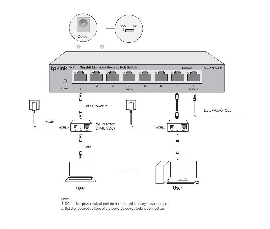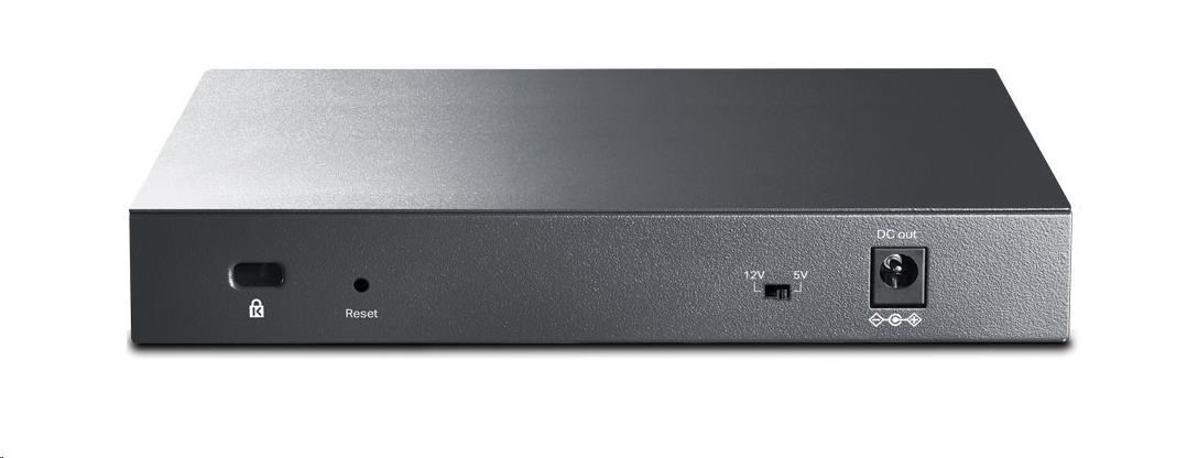 Pasivní PoE switch RP108GE (TL-RP108GE) má sedm gigabitových PoE vstupních portů, které umožňují získávat elektrickou energii z uživatelských zásuvek pomocí PoE injektorů. Vybaven jedním PoE výstupním portem může switch napájet CPE nebo podobné zařízení pomocí Portu 8. Výstupní DC port podporuje obě napětí 5 V a 12 V a lze jej tak použít k napájení zažízení jako ONT. Díky integraci přepínání dat a PoE napájení do jednoho zařízení, RP108GE šetří místo, minimalizuje množství kabelů a eliminuje potřebu vyhrazené elektrické zásuvky - snižuje tak náklady na instalaci a zjednodušuje instalaci PoE zařízení. Poznámka: Vstupní PoE porty podporují pasivní 24V a 48V PoE injektory. Použijte pouze jeden typ injektorů, nekombinujte různé úrovně napětí. Úroveň napětí výstupního pasivního PoE portu je shodná s napětím zvoleného vstupního PoE injektoru