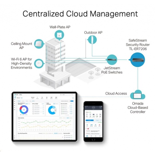 - Centralizovaná správa - Cloudový přístup a aplikace Omada pro maximální pohodlí a snadnou správu.
