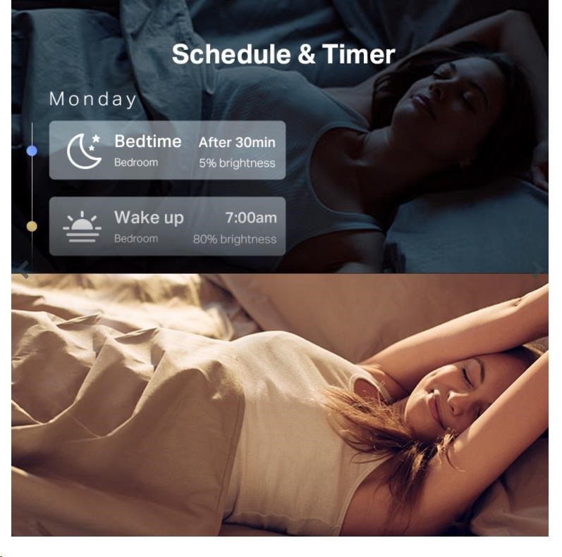 - Časový plán a časovač – Vytvočte si pravidelný plán pro zapnutí/vypnutí s nastaveným jasem a barvami.