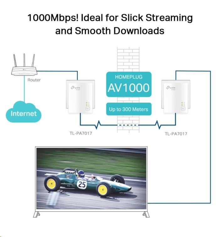 Využitím pokročilé technologie HomePlug AV2, TL-PA7017 KIT zajišťuje stabilní a vysokorychlostní kabelové připojení a poskytuje datové přenosy až 1 000 Mbps po elektrické síti s dosahem až 300 metrů. Streamujte v HD, hrajte online a stahujte velké soubory bez přerušení díky spolehlivé powerline technologii.