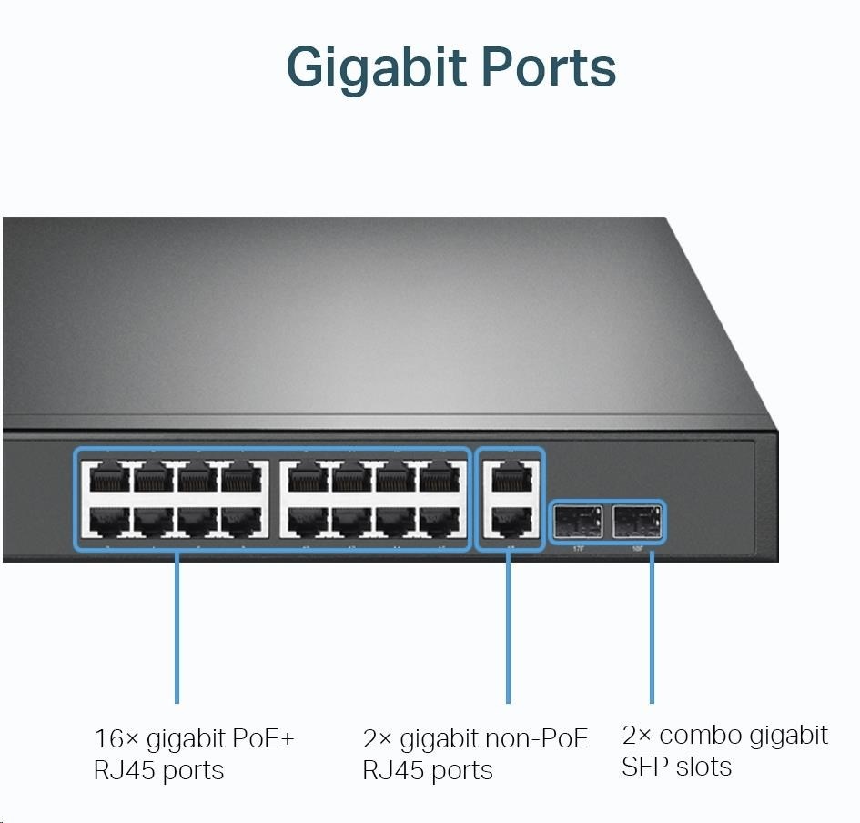 - 16× Gigabit PoE+ RJ45 ports, 2× Gigabit on-PoE RJ45 ports, and 2× Combo Gigabit SFP slots