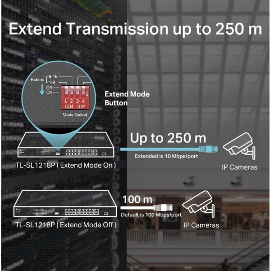 TP-Link CCTV switch TL-SL1218P (16x100Mb/s, 1xGbE uplink, 1xGbE/1xSFP combo uplink, 16xPoE+, 150W)