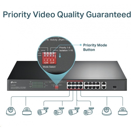 - Prioritní režim pro porty 1-8, který zaručuje kvalitu citlivých aplikací, jako je například video monitor.