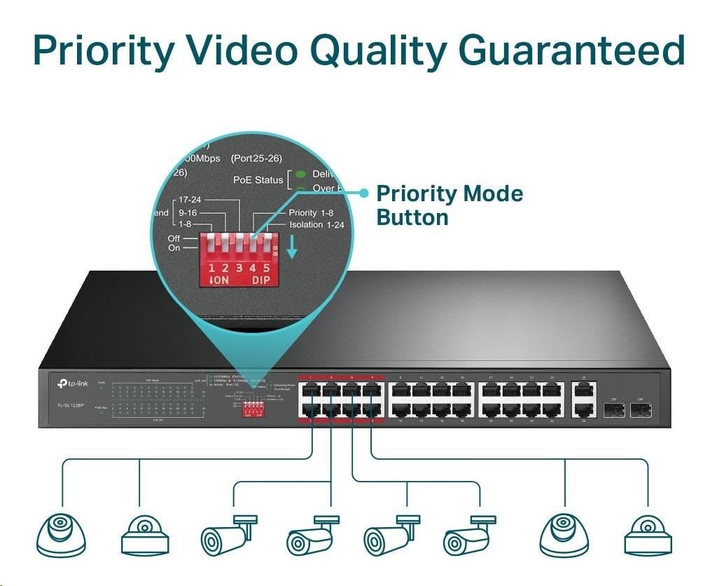 • Prioritní režim zajišťuje vysokou prioritu portů 1–8 a zaručuje kvalitu citlivých aplikací, jako je video monitor