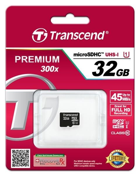 TRANSCEND MicroSDHC karta 32GB Premium, Class 10 UHS-I 300x, bez adaptéru