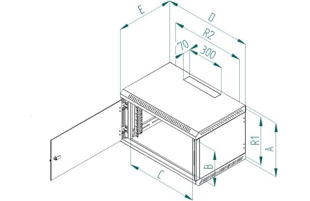 Přesné rozměry a další technické údaje jsou uvedeny níže (hodnoty R1 a R2 označují rozteče montážních otvorů pro zavěšení rozvaděče na zeď). Maximální zatížení rozvaděče je 30 kg