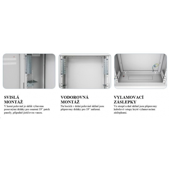 Hybridní domovní rozvaděč SHA - IP20, nosnost 30 kg. Rozvaděč je určen k montáži na omítku (model SHA) SVISLÁ MONTÁŽ V horní polovině je skříň vybavena posuvnými držáky pro osazení 19“ patch panely, případně jističovou vanou. VODOROVNÁ MONTÁŽ Na bocích v dolní polovině skříně jsou připraveny držáky pro 19“ zařízení. VYLAMOVACÍ ZÁSLEPKY Ve stropě a dně skříně jsou připraveny kabelové vstupy kryté vylamovacími záslepkami..