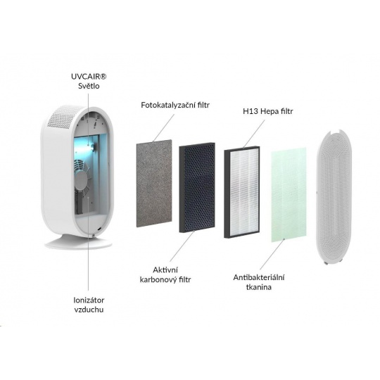 Čistička je vybavena sterilizační UV lampou, která díky technologii UVCAir® pomáhá efektivně ničit mikroby a viry a zlepšuje tak celkovou kvalitu ovzduší ve vaší domácnosti. Jistě vás potěší i přítomnost ionizátoru. Technologie IonTrue® zvyšuje koncentraci záporných iontů. Dostatek záporných iontů ve vzduchu prospěšně ovlivňuje naše zdraví, má pozitivní dopad na naši psychiku i soustředění a může pomoci i s bolestmi hlavy. Díky ionizátoru čistička obohacuje vzduch o záporné ionty, zbavuje vzduch prachových částic a vzduch poté lépe okysličuje krev.