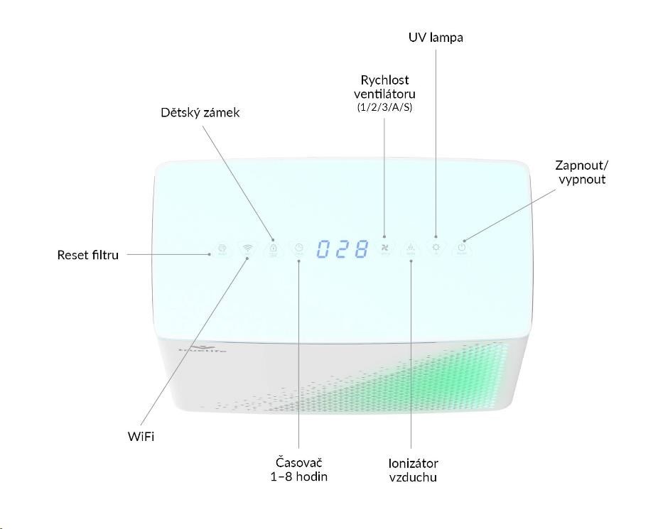 Ovládání čističky vzduchu je velmi jednoduché a intuitivní. Všechny funkce lze nastavit pomocí ikon na dotykovém displeji.