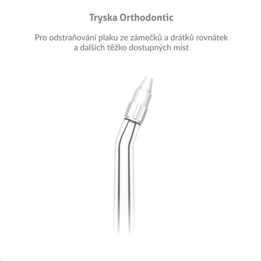 Ortodontická tryska pro odstraňování plaku ze zámečků a drátků rovnátek a dalších těžko dostupných míst.