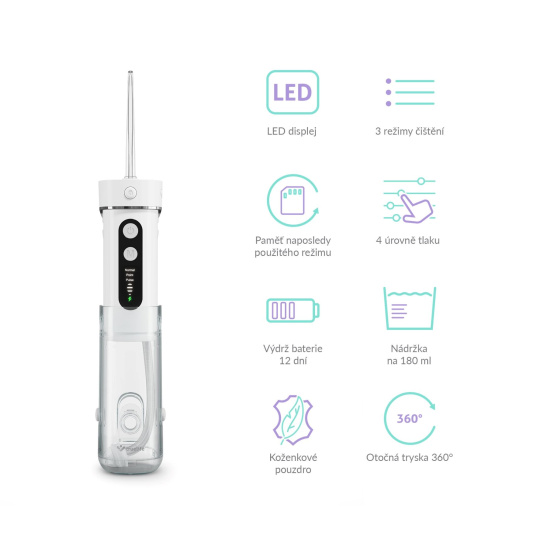 Ústní sprchu oceníte nejen doma, ale také na cestách. Je vybavena koženkovým pouzdrem pro uložení a její baterie vydrží 12 dní při používání 2x denně po dobu doporučených 2 minut. Dobu použití vám hlídá automatický časovač. Aktuální nastavení zobrazuje přehledný displej a funkce paměť si zapamatuje naposledy použitý režim, který po opětovném spuštění aktivuje. Otočná hlavice o 360 stupňů je zárukou, že pomocí sprchy vyčistíte i to nejhůře dostupné místo. Po použití trysku uschováte v horní části sprchy, kde je pro ni vyhrazen prostor.