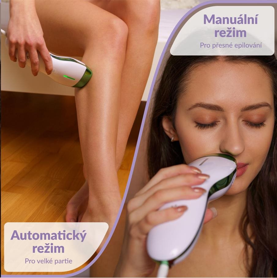Epilátor TrueLife BELLE IPL E3 nabízí dva režimy. Manuální režim jednotlivých záblesků je vhodný k epilaci malých a těžko dostupných oblastí, jako jsou obličej, podpaží, oblast bikin nebo kotníky. S automatickým režimem rychle a pohodlně ošetříte větší oblasti, například nohy. Jakmile se přístroj dotkne epilované oblasti, jednoduše podržíte tlačítko ovládání po dobu 3 sekund, epilátor se přepne do automatického režimu, kdy při plynulém pohybu po pokožce bude neustále vydávat záblesky.