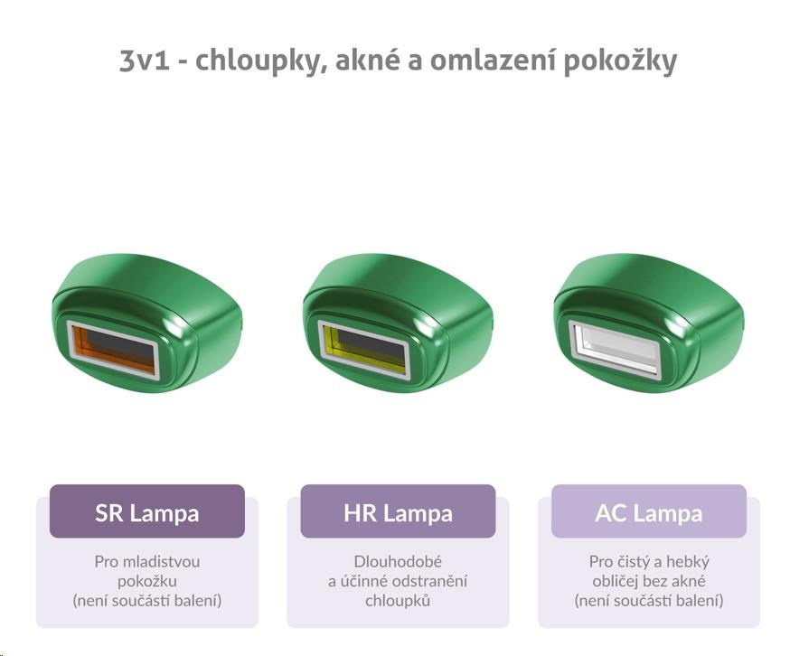 Epilátor TrueLife BELLE IPL E3 využijete kromě samotné epilace i k dalším aplikacím. Stačí pouze vyměnit lampu. K dlouhodobému a účinnému odstranění chloupků vám poslouží HR lampa, která je součástí balení. Nejednoho člověka trápí akné. Pokud chce mít obličej čistý a hebký na dotek, doporučujeme si pořídit AC lampu. Pokud chcete svoji pokožku omladit, pomůže vám s tím SR lampa.