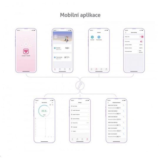 Díky zabudovanému Bluetooth lze teploměr spárovat s telefonem a hodnoty měření uchovávat v mobilní aplikaci.