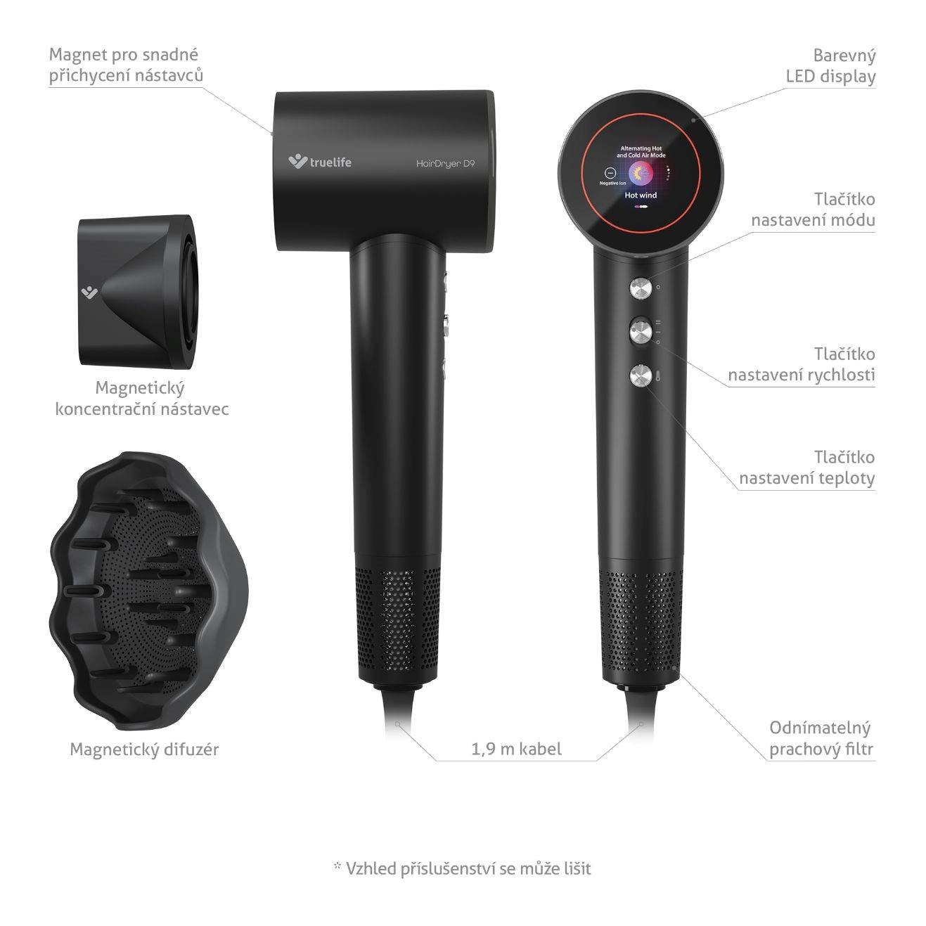 TrueLife HairDryer D9 patří ke špičce ve své kategorii. Jeho ionizátor s technologií TrueLife UltraIonic® produkuje až 200 milionů záporných iontů a vlasy jsou tak hladší a zdravější. Vlhkost se z dlouhých a polodlouhých vlasů odpaří rychleji a za využití nižší teploty. Šetrnost a rychlost vysoušení je dána také motorem s technologií TrueLife UltraFlow®, který provádí až 110 000 otáček za minutu. Praktickým vybavením fénu je kulatý barevný LED displej přehledně zobrazující veškeré informace o foukání, tedy navolený mód, rychlost či ionizaci.