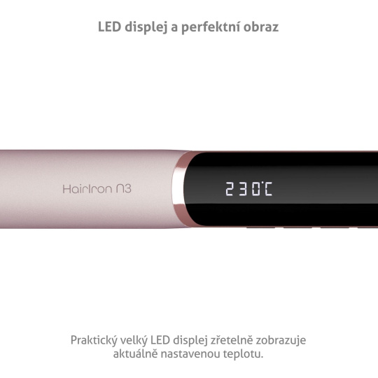 Seznamte se s novou královnou vaší koupelny pro rychlý a přirozený styling, žehličkou na vlasy TrueLife HairIron N3 s velkým LED displejem. Vaše vlasy narovná s maximální péčí a zanechá je tak hebké, že se jich budete chtít stále dotýkat. Na první pohled zaujme svým designem se zaoblenými hranami, které umožňují i tvorbu vln. Ještě víc si vás získá luxusním keramickým povrchem nahřívacích destiček, které se rychle zahřejí, udržují teplo rovnoměrně rozložené, čímž chrání vlasy před poškozením a vysušením a dodávají jim dokonalý lesk. Perfektní účes a více vyživené vlasy zajistí ionizátor s technologií TrueLife UltraIonic®, díky níž dochází k rychlejšímu odpaření vlhkosti z vlasů za využití nižší teploty. Možností nastavení teploty nabízí žehlička hned 12, zvolíte si tak péči na míru vašim vlasům. Komfortní užití je podpořeno otočným kabelem o plných 360° a zámkem, který usnadňuje uskladnění například na cestách.