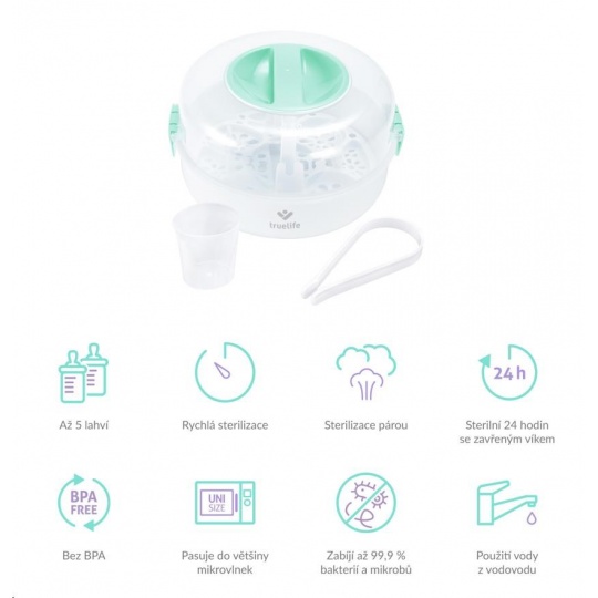 Ochrana imunitního systému vašeho dítěte pro vás nemusí znamenat neustálé vyvařování lahviček a dudlíků. Se sterilizátorem do mikrovlnné trouby TrueLife Invio MS5 sterilizujete dětské lahvičky, kousátka a další předměty během dvou minut. K tomu potřebujete jen obyčejnou vodu a mikrovlnou troubu. Sterilizátor využívá nemocniční metodu parní sterilizace, která je rychlá, účinná a bez chemických látek. Ničí tak 99,9 % bakterií a mikrobů, které se na dětských předmětech nacházejí, aniž by poškodil jejich povrch. Sterilizátor je navržen pro většinu mikrovlnných trub na trhu a zvládne většinu typů kojeneckých lahví. Pojme až 5 lahviček naráz a snadno se ovládá. Díky kompaktním rozměrům s ním můžete bez problému cestovat.