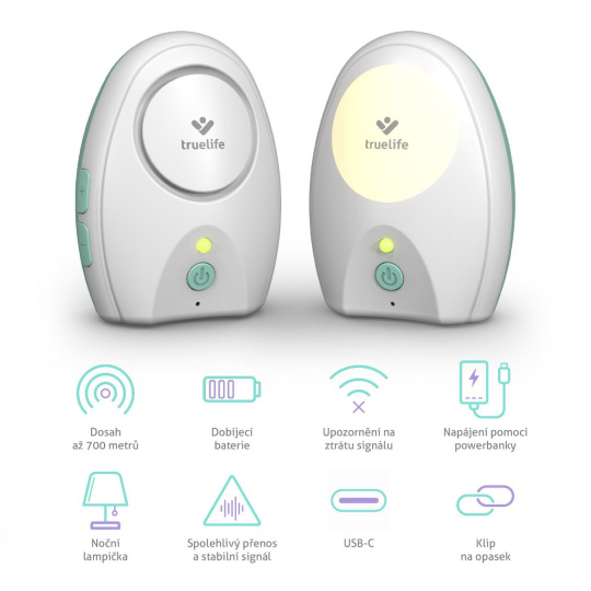 Digitální audio chůvička s dobíjecími jednotkami, jednosměrná komunikace, dosah 700 m, klipsy na opasek či zavěšení, detekce slabého signálu, detekce slabé baterie, noční světýlko, USB-C napájení, regulace hlasitosti, barva: bílá/zelená. TrueLife Premium Guarantee..... více