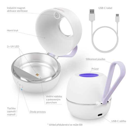 S hmotností pouhých 73 gramů a kompaktními rozměry se sterilizátor vejde do každé tašky nebo kabelky. Silikonové poutko umožňuje snadné uchycení třeba na kočárek, takže ho budete mít vždy po ruce. A když zrovna není potřeba sterilizovat dudlík, zvládne rychle vydezinfikovat i menší předměty, jako jsou šperky nebo drobné doplňky.