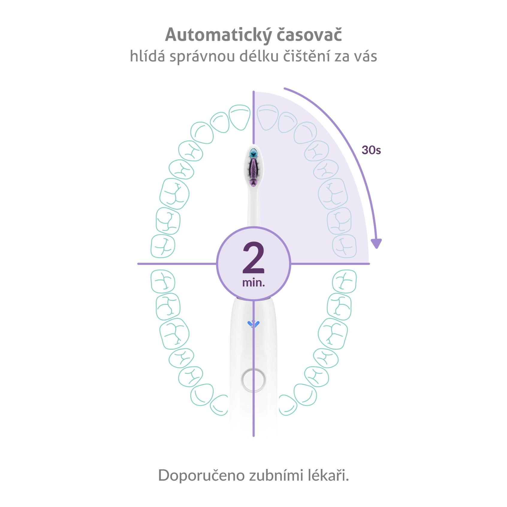 Zuby je ideální čistit po dobu 2 minut, což ohlídá automatický časovač. Navíc vždy po 30 vteřinách upozorní, že je potřeba přejít na čištění další části úst.