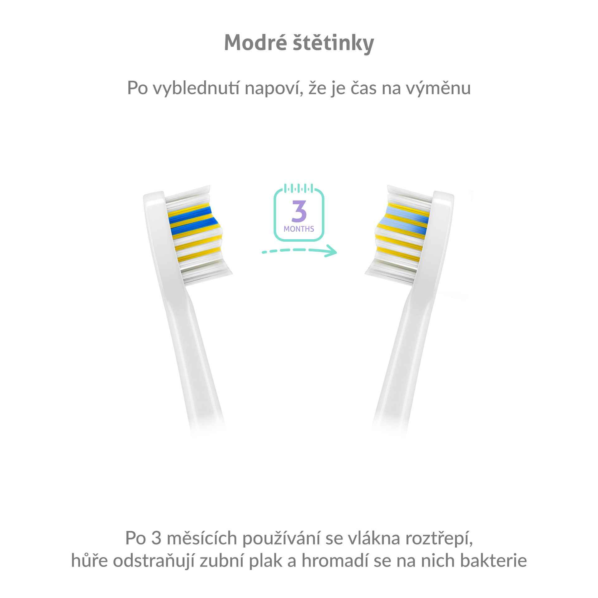 Hlavice disponují modrými štětinkami, které indikují míru opotřebení. Snadno poznáte, že je načase hlavici vyměnit.