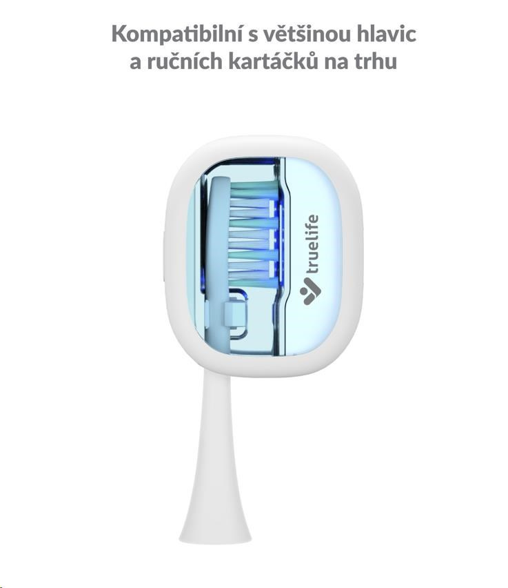 UV sterilizátor od TrueLife je malý přístroj, který efektivně ničí bakterie usazující se na hlavicích zubních kartáčků. Díky UV-C záření o vlnové délce 200-275 nm proniká k membránám bakterií, virů a plísní a zabraňuje jejich šíření. Je kompatibilní s většinou hlavic elektrických i manuálních kartáčků na trhu.