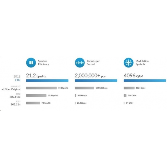 AF-5XHD je v současné době nejvýkonnějším a nejlépe vybaveným airFiber zařízením od Ubiquiti Networks. Revoluční procesor s označením airFiber LTU IC doáže zpracovat přes 2 miliony+ paketů za sekundu při 1Gbps+ (TDD) reálného datového toku v bezlicenčním pásmu 5GHz při 1024QAM (v plánovaném firmwaru je počítáno s podporou až 4096QAM s ještě vyšší propustnosí). Mezi další klíčové vlastnosti můžeme zařadit 2x Gigabit LAN, kdy jeden port je určen pouze pro management, časová synchronizace přes GPS, dedikovaný spektrální analyzér, vysoká odolnost proti vodě (IP67) a nastavitelná šířka kanálu 10/20/30/40/50/60/80 a 100MHz. AirFiber 5XHD je díky velmi dobré konstrukci a přiloženému gumovému adaptéru odolný vůči vodě a je ideální pro jakékoli povětrnostní podmínky.