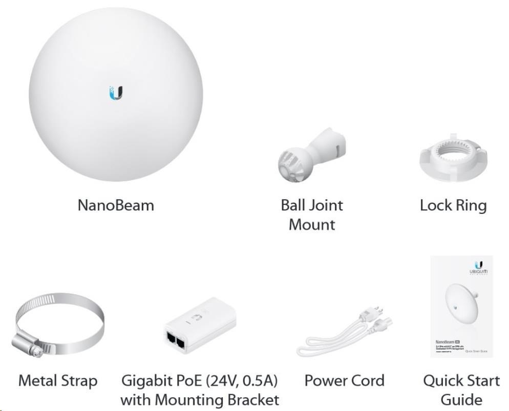 Obsah balení: - Zařízení - Gigabit PoE napájecí adaptér 24V/0.5A - Napájecí kabel - Stahovací páska - Plastový kloub + plastový zámek