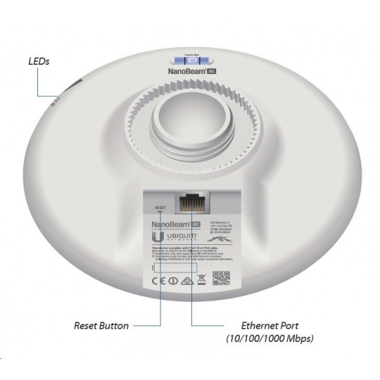 Uvnitř NanoBeamu se nachází výkonný MIPS procesor Atheros 74KC s frekvencí 720MHz, kterému sekunduje 128MB operační paměti typu DDR2 a 8MB Flash paměť. Síťový port podporuje 10/100/1000 Ethernet a lze po něm jednotku napájet pasivním Gigabit PoE 24V/0,5A adaptérem, které je součástí balení (aktivní PoE dle 802.3af není podporováno).