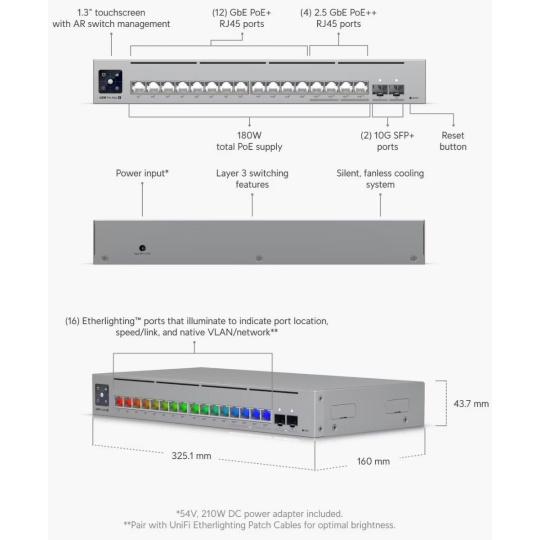 Popis produktu Ubiquiti Pro Max 16-PoE je novým L3 switchem, který nabízí 4x 2.5 Gbps porty s PoE++ až 60W a 12x 1 Gbps porty s PoE+. Celkový PoE budget je 180 W. Pro připojení pomocí optického rozhraní jsou připraveny 2 SFP+ porty dosahující rychlosti až 10 Gb/s. Switch je napájen DC adaptérem 54V DC 210W. Upozornění:pro montáž do racku je nutné dokoupit příslušenství Ubiquiti Pro Max 16 Rack Mount. Etherlighting technologie Switch podporuje technologii Etherlighting, která umožňuje barevně indikovat lokaci portu, linkovou rychlost, nadefinované typy zařízení, PoE status nebo barevně odlišit jednotlivé VLAN. Správa přes UniFi Controller Switch nemá webový management, ale je spravován centrálně pomocí UniFi Controlleru s podporou mobilní aplikace UniFi a nabízí rozsáhlou sadu pokročilých přepínacích protokolů a funkcí L2, včetně provozního režimu (přepínání, zrcadlení nebo agregace) na port. UniFi Network Controller a mobilní aplikace umožňují správcům konfigurovat a sledovat prakticky všechny funkce přepínače v grafickém uživatelském rozhraní odkudkoli. Obsah balení • Zařízení • Napájecí DC adaptér • Montážní set Technické parametry Konektory a rozhraní Rychlost LAN:(12) 10/100/1000Mbps + (4) 10/100/2500Mbps Optické rozhraní:(2) 1G/10Gbps Ostatní:Dotykový displej Napájení Typ napájení:DC konektor Typy PoE:PoE-Out (pouze) Podporované PoE-Out standardy:802.3af, 802.3at, 802.3at - ultra PoE (60W) Počet PoE Out portů:16 PoE budget [W]:180 Max. spotřeba energie [W]:210 Napájení přes konektor/svorkovnici:54V DC Fyzické charakteristiky Provedení:Na zeď, Desktop, Rackmount Ventilátory:Ne Šasi:Kovové Tlačítka:Reset Provozní teplota [°C]:-5 až 40 Šířka [mm]:325 Výška [mm]:44 Hloubka [mm]:160 Obecné Rychlost přepínání [Gbps]:84 Rychlost předávání paketů [Mpps]:62 Software Management:UniFi Network Funkce:VLAN, DHCP snooping, L3 Výchozí IP adresa:Dynamická z DHCP.