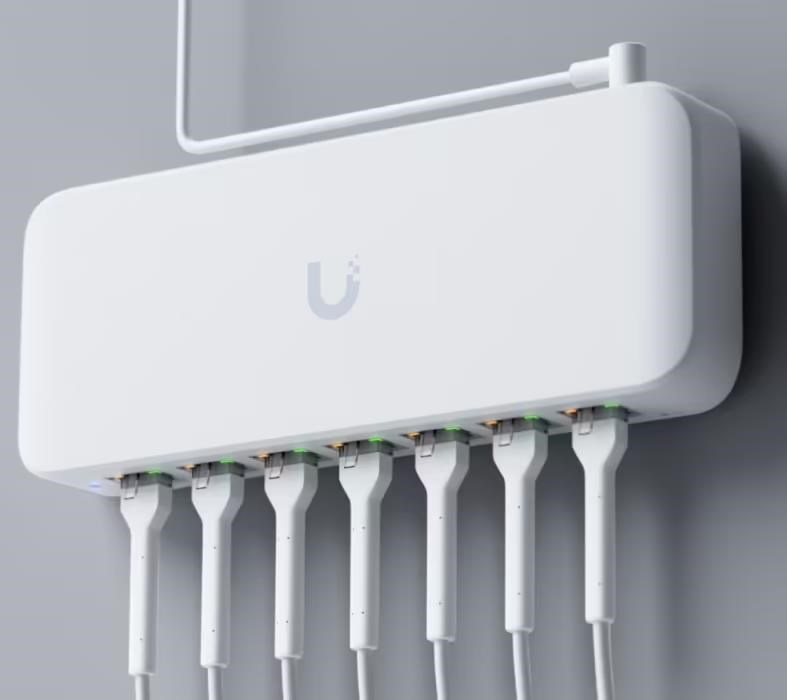 Popis produktu Kompaktní 8 portový gigabitový PoE switch. Switch disponuje 1 PoE in portem a 7 PoE out porty s podporou PoE napájení 802.3af/at s maximálním zatížením až 30W na port. Switch je spravován pomocí aplikace UniFi network umožňující centrální správu Vaší sítě včetně cloudového přístupu. Maximální PoE budget switche je závislý na způsobu napájení: • při napájení DC adaptérem 54V/3,9A (součástí balení) je PoE budget 202W • při napájení pasivním PoE adaptérem nebo 60W PoE++ adaptérem je PoE budget 45W Obsah balení • switch • napájecí adaptér 54V/3,9A • montážní set Technické parametry Konektory a rozhraní Rychlost LAN:(8) 10/100/1000Mbps Napájení Typ napájení:DC konektor, PoE Typy PoE:PoE-Out + PoE-In Podporované PoE-Out standardy:802.3af, 802.3at Počet PoE Out portů:7 PoE budget [W]:202 Max. spotřeba energie [W]:60 Napájení přes konektor/svorkovnici:44 .. 57V DC Fyzické charakteristiky Provedení:Na zeď, Desktop Ventilátory:Bez ventilátoru Šasi:Plastové Tlačítka:Reset Provozní teplota [°C]:-15 až 45 Šířka [mm]:203 Výška [mm]:33 Hloubka [mm]:76 Obecné Rychlost přepínání [Gbps]:8 Software Management:UniFi controller Funkce:VLAN.