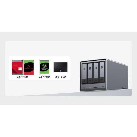 UGREEN NAS je kompatibilní s extrémně širokou škálou úložných disků, včetně 3,5„/2,5“ SATA disků a M.2 SSD. Podporovány jsou všechny nejoblíbenější značky pevných disků a neexistuje žádné omezení na konkrétního výrobce.