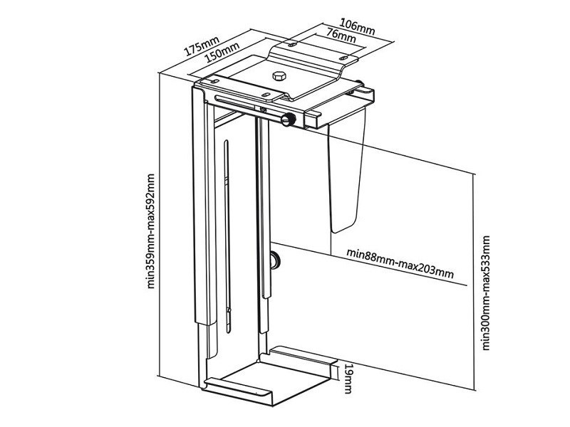 Univerzální držák na PC Fiber Mounts M7C13B Profesionální držák na PC, uchycení na stůl nebo stěnu, nastavení na požadované rozměry, nosnost 10kg Držák na PC špičkové kvality a bezpečnosti. Velmi pevné uchycení vašeho PC na stůl nebo stěnu. Nastavení na rozměry vašeho PC. Materiál ocel, barevné provedení černé. Na PC s hmotností až 10kg. Snadná a rychlá instalace. Záruka 5 let. Držák na PC počítač pro uchycení pod stůl, na bočnici stolu, na stěnu nebo i na strop Fiber Mounts M7C13B Technické údaje: nosnost 10kg univerzální, vhodný na většinu dostupných PC šířka PC od 88mm do 203mm výška PC od 359mm do 592mm délka PC není podstatná otáčení do stran zajištění v požadovaných rozměrech profesionální výrobek špičkové kvality bezpečný, pevný, spolehlivý uchycení na svislou nebo vodorovnou plochu pod stolovou desku, na bočnici stolu, na stěnu nebo i na strop materiál ocel barevné provedení černé záruka 5 let Stolní držák pro uchycení počítače PC toweru Fiber Mounts M7C13B Univerzální držák PC, který uchytíte na jakoukoliv svislou nebo vodorovnou plochu - pod desku stolu, na bočnici stolu, na stěnu nebo třeba na strop. Univerzální, nastavení na potřebné rozměry a zajištění v pozici. Snadná a rychlá montáž..