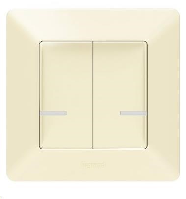 Valena Life with Netatmo dvojitý bezdrátový spínač osvětlení (baterie CR2032 a oboustranná lepenka součást balení) pro ovládání až 20 drátových přístrojů (spínačů/stmívačů, zásuvek, mobilních zásuvkových adaptérů, kabelových výstupů a mikromodulů pro osvětlení). Zadní strana je zcela plochá (lze montovat na zeď, sklo, nábytek pomocí šroubů nebo oboustranné lepenky) - barva Béžová, dodáván s rámečkem v barvě Béžová