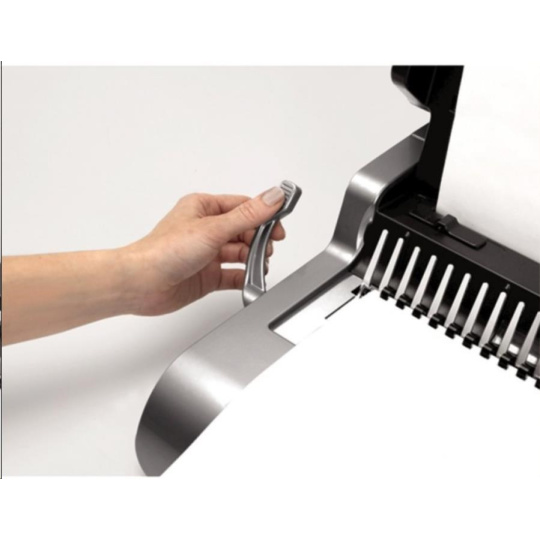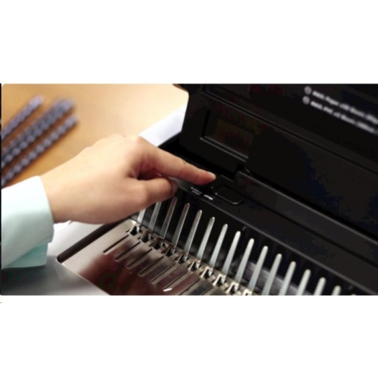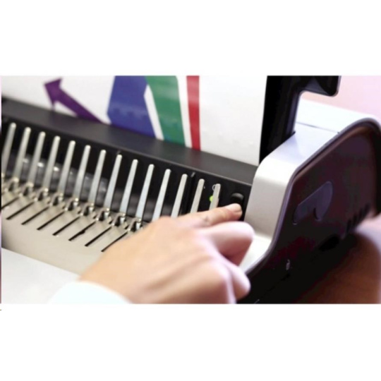 Stroj je vybaven větším zásobníkem na uložení několika plastových hřbetů a integrovanou měrkou pro správnou volbu průměru hřbetu.