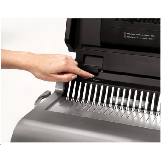 Špičkový design, funkční preciznost a komfortní obsluha jsou vlastnosti tohoto vazače s elektrickým pohonem děrovacího nástroje. Děrovací kapacita až 25 listů 80 g papíru. Kapacita vazby až 500 listů. Je optimální volbou pro komfortní práci při kancelářském použití. Vkládání děrovaných listů shora a přesné nastavení dorazu svazku významně pomáhá pro zajištění jeho bezchybné perforace.